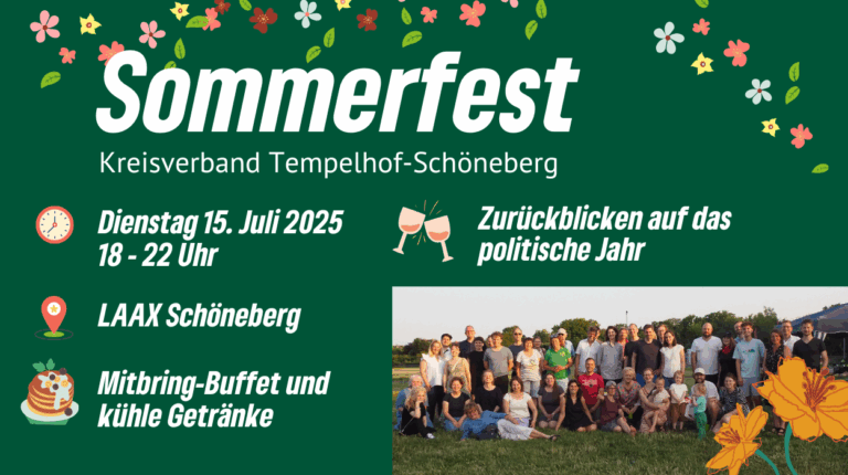 Liebe Mitglieder, Nach dem gelungenen Bundestagswahlkampf im Januar/Februar und vielen Aktionen im Frühjahr wollen wir gemeinsam mit euch zusammenkommen und ausgiebig feiern! Daher laden wir euch herzlich zum Sommerfest vom Kreisverband Tempelhof-Schöneberg ein und freuen uns darauf, gemeinsam mit euch zu feiern! ⏰ Dienstag, 15. Juli 2025 | 18 – 22 Uhr 📍 LAAX | Fritz-Elsas-Straße 30, 10825 […]