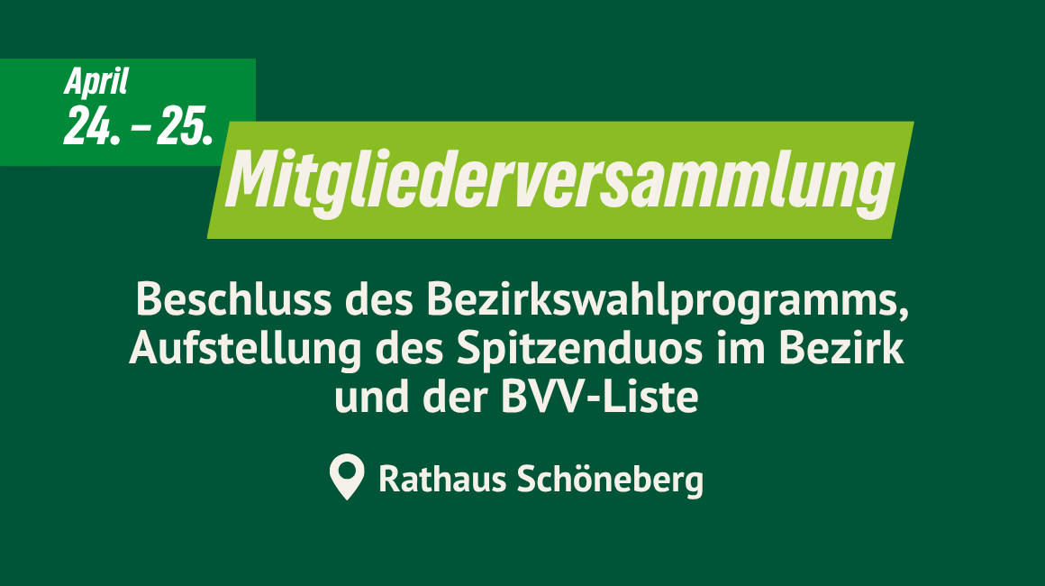 👋 Wir laden euch herzlich zu unserer Mitgliedervollversammlung (MVV) ein. Es wird in jedem Falle spannend, denn am Freitag stimmen wir über unser Wahlprogramm für den Bezirk ab und am Samstag stellen wir unsere Liste für die Bezirksverordnetenversammlung (BVV) auf. Alle Tagesordnungspunkte und die Möglichkeit Bewerbungen hochzuladen, findet ihr im Antragsgrün.