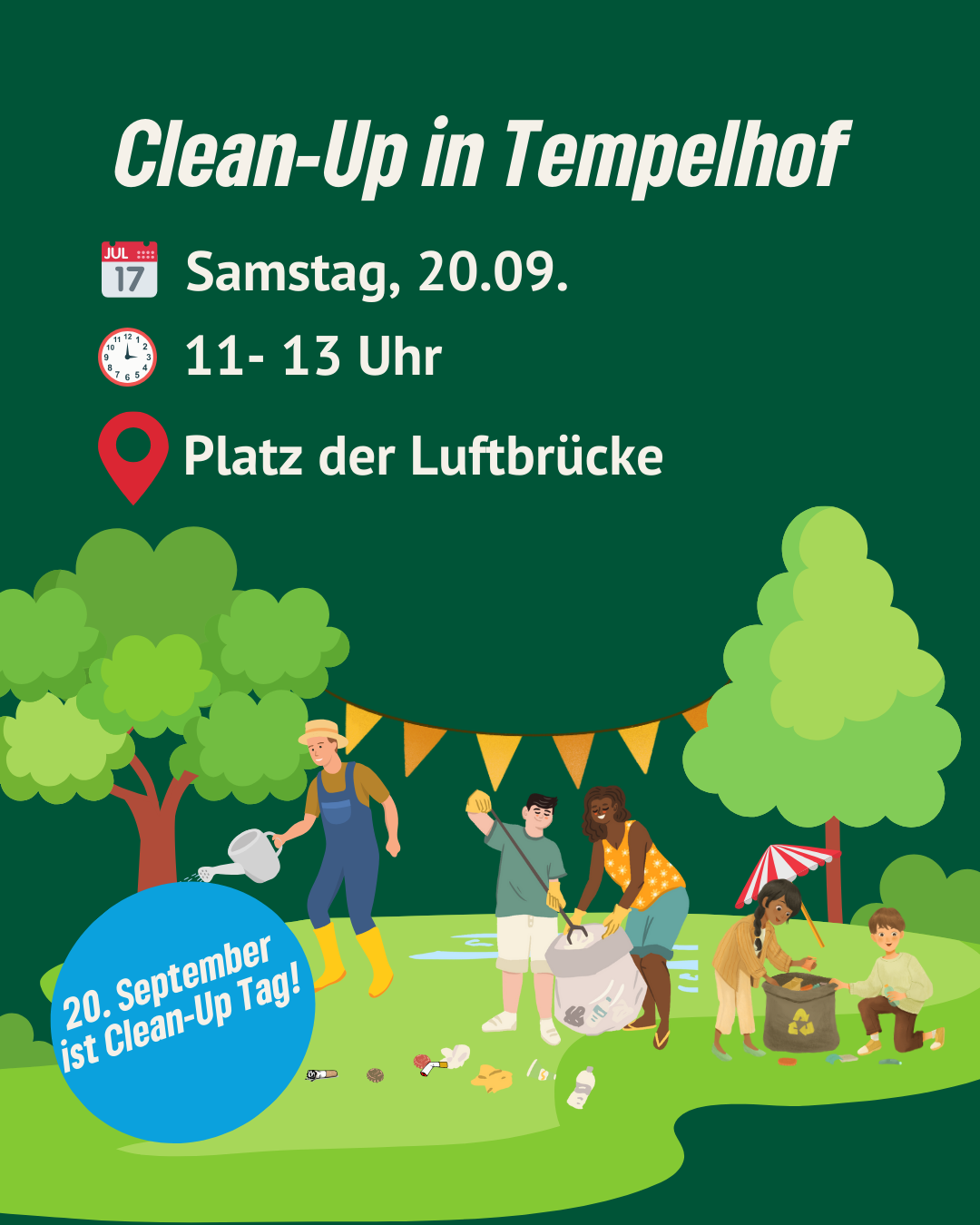 es ist wieder soweit: Der Clean-Up Day steht vor der Tür – und wir freuen uns sehr, wenn ihr auch dieses Jahr wieder mit dabei seid! 🗓 Wann? Samstag, 20. September, 11-13 Uhr📍 Wo? Platz der Luftbrücke Zur Verfügung stehen:🟢 Handschuhe🗑️ Müllgabeln🛍️ Müllsäcke Vielen Dank für euren Einsatz in unserem […]