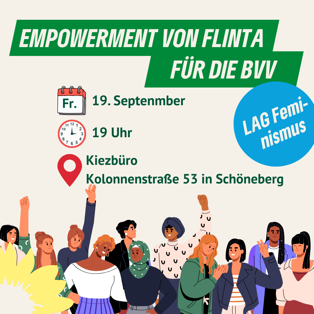 Die LAG Feminismus lädt ein zu einer Sitzung zum Empowerment von FLINTA für die BVV! Bei einer Panel-Diskussion mit den BVV-Verordneten Astrid Bialluch-Liu (Tempelhof-Schöneberg), Chantal Münster (Marzahn-Hellersdorf), Samira Tanana (Neukölln) und Birgit Vasiliades (Steglitz-Zehlendorf) wird hoffentlich euer Interesse für die Bezirksverordnetenversammlung geweckt. Ihr werdet Einblicke in die Arbeit der BVV-Verordneten […] |