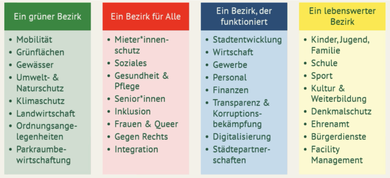 Diese vier Kapitel orientieren sich an unseren Zielen für Tempelhof-Schöneberg und bündeln unsere Expertisen: